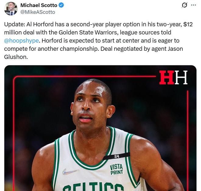 在搞定库明加续约之后,勇士队也终于可以正式签约霍福德等新援,名记Mike Scotto曝出双方动用中产特例达成了一份2年价值1200万的合同,第二年为球员选项。