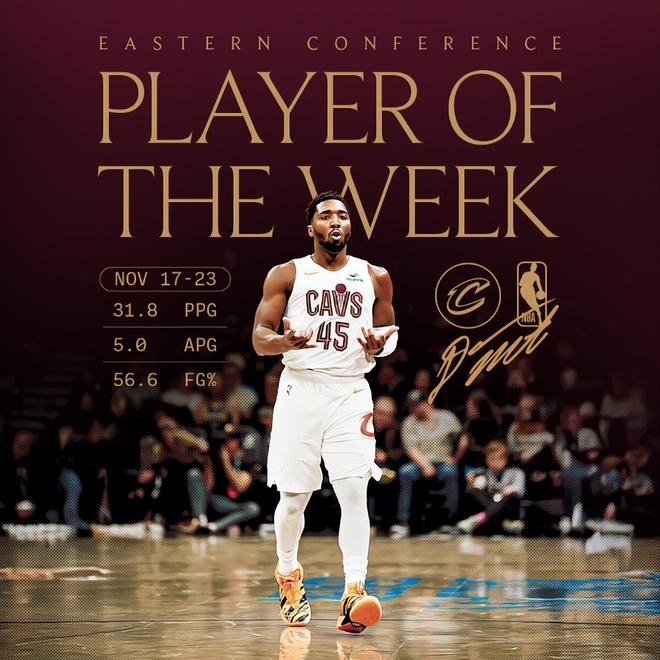 过去一周,米切尔率队取得3胜1负的战绩,他场均贡献31.8分6.3篮板5助攻,投篮命中率56.6%。